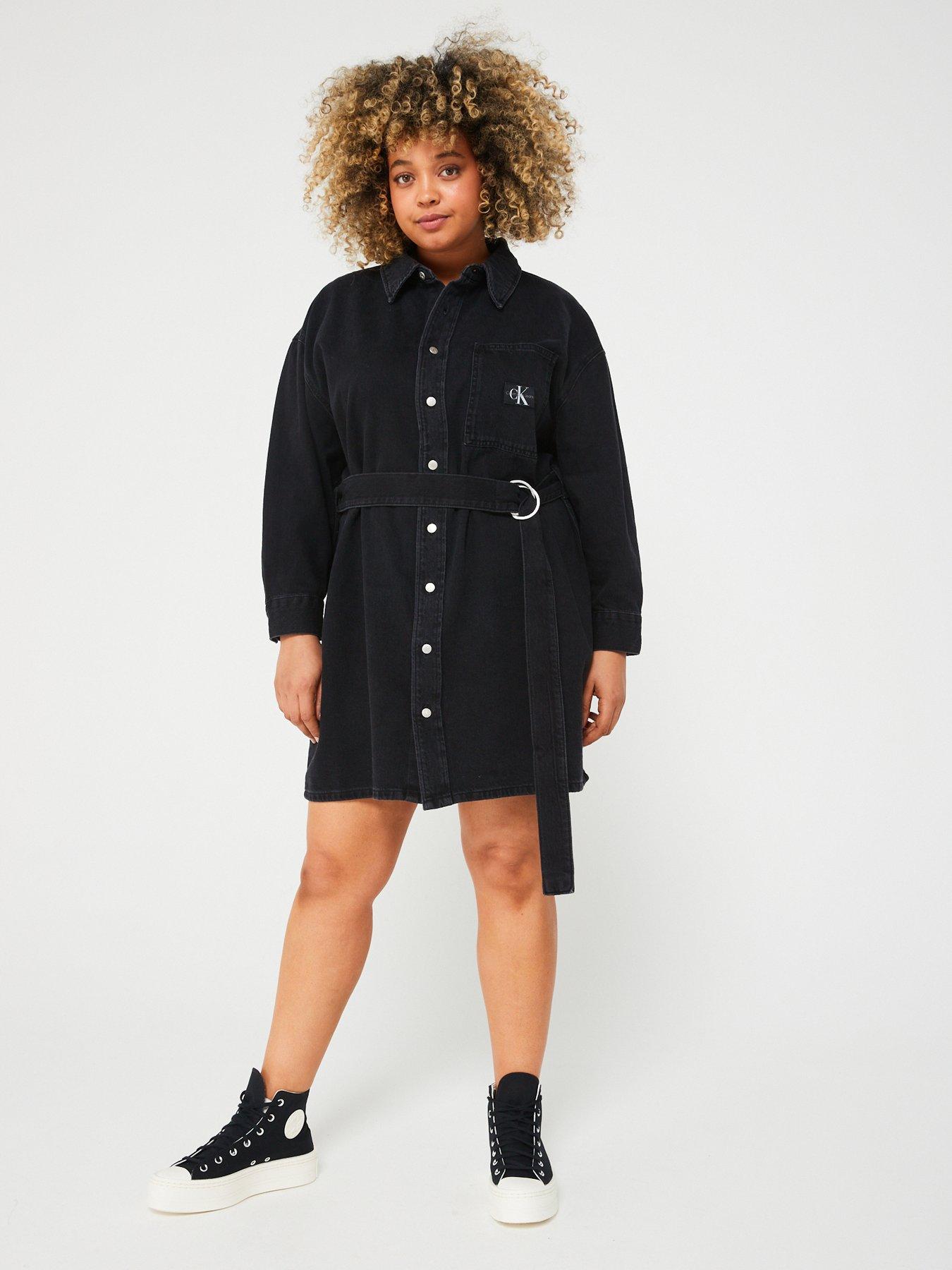 Black denim belted best sale dress